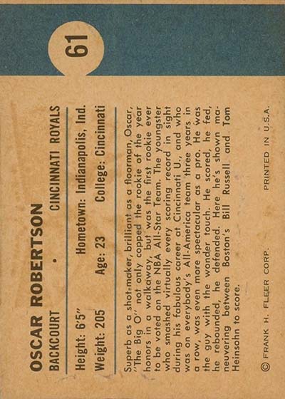 Without a mainstream set of basketball cards since 1957-58 Topps, lots of players found their first major cards in 1961-62 Fleer. Leading the way is the Wilt Chamberlain rookie card. Not surprisingly, this is one of the most valuable vintage basketball cards ever produced. Other top 1961-62 Fleer Basketball rookie cards include Jerry West, Elgin Baylor and Oscar Robertson.