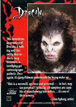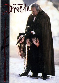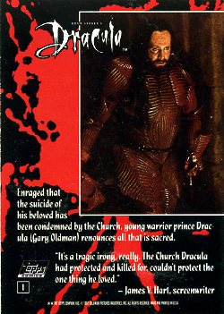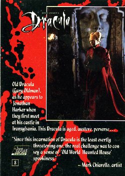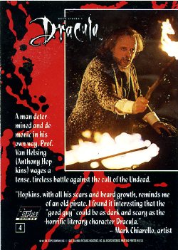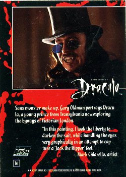 The 16-card set was spread over the four issues of the Topps comic adaptation of Bram Stoker’s Dracula, which starred Keanu Reeves, Gary Oldman and Anthony Hopkins. Each issue had four different cards and were inserted in chronological order. So issue 1 had #1-4, issue 2 had #5-8 and so forth.