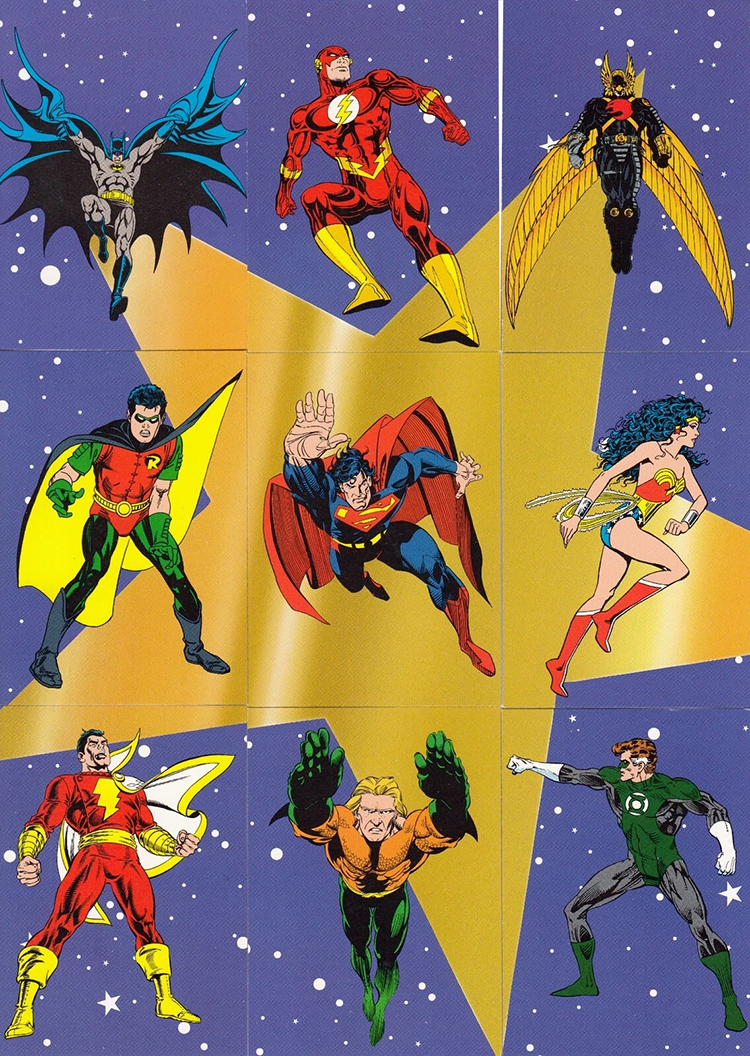 The 1994 SkyBox DC Stars checklist is arranged by key titles and themes like Batman, Superman, The Justice League and general villains.