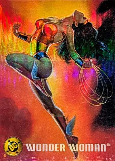 For the inserts, three Legacy cards are the toughest at 1:36 packs. Superman, Batman and Wonder Woman make up the checklist with a more fine art style and Refractor-like stock.