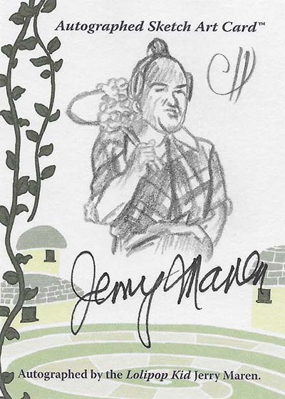 Munchkin Autographs (1:140 packs) feature four cards from three different actors: Mickey Carroll, Karl Slover and Jerry Maren. Maren is featured on additional Autographed Sketch Cards that have art done by Chris Henderson.