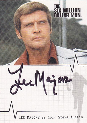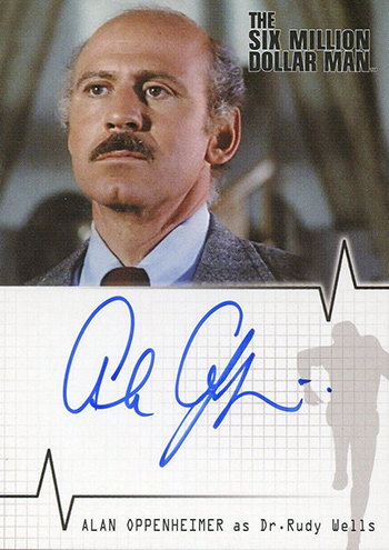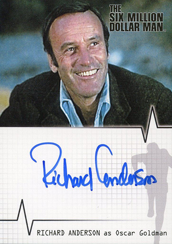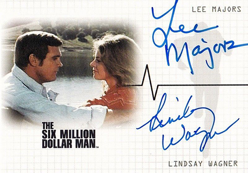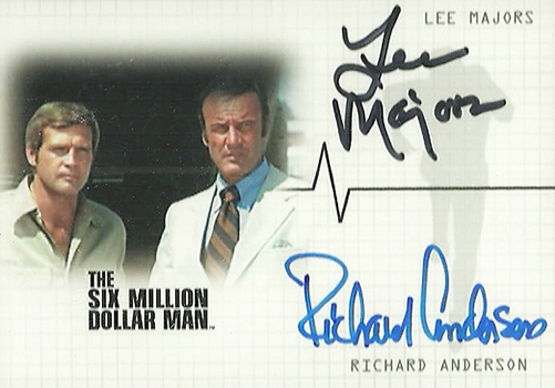 Lee Majors headlines the set. He not only has a single-signed card but a dual autograph with Richard Anderson (Oscar Goldman). Anderson also has his own card. Other signers in the 2007 Rittenhouse Six Million Dollar Man Color Autograph Expansion set include Lindsay Wagner (Jaime Summers/the Bionic Woman) and Alan Oppenheimer (Dr. Rudy Wells).