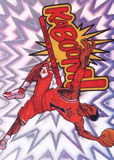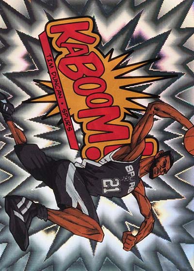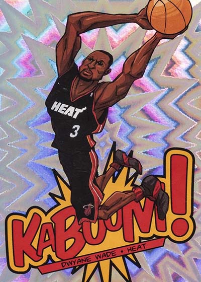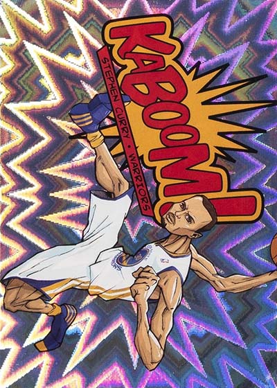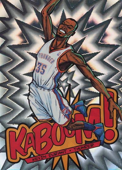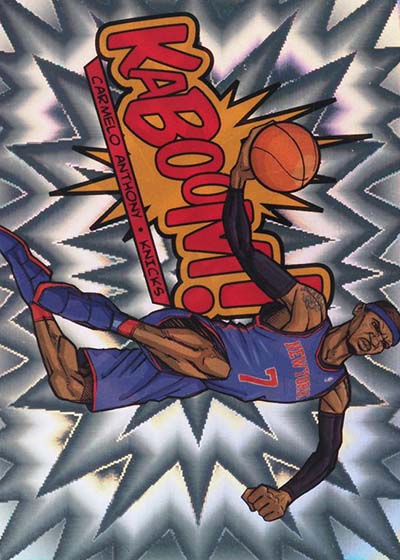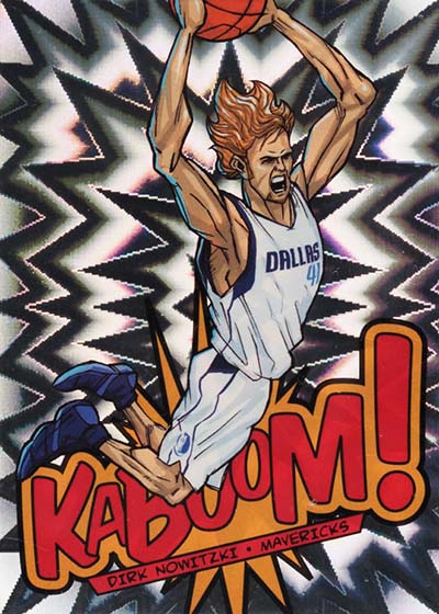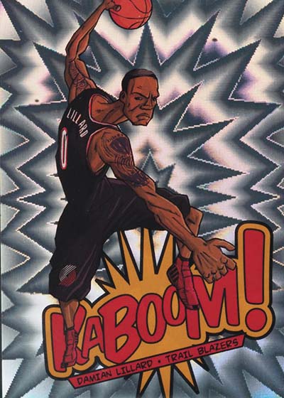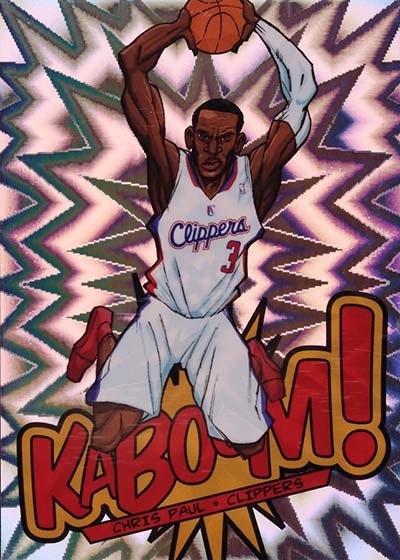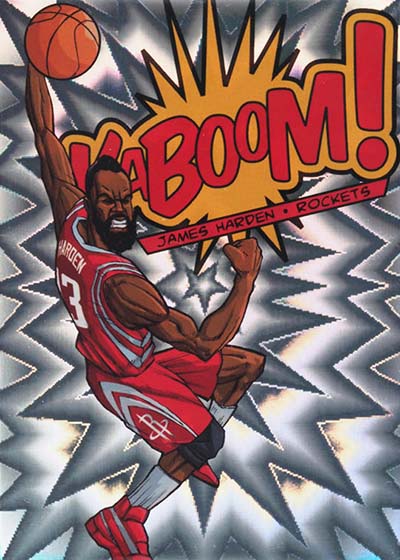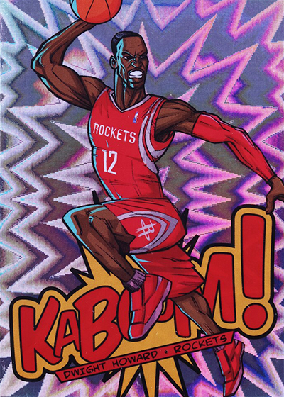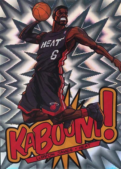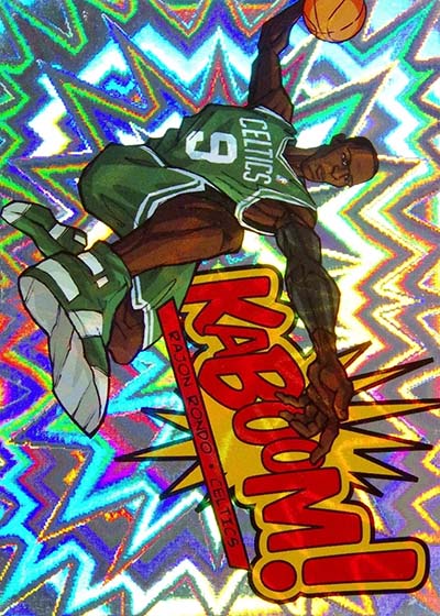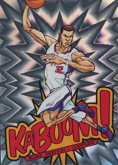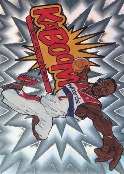 While the larger-than-life illustrations brought the pizzazz to the 2013-14 Panini Innovation Basketball Kaboom cards, the card stock provided the pop. Cards are done on foil with a bright exploding pattern running in the background. It’s kind of like what you’d expect to see when something blows up in a Looney Tunes cartoon or when Batman gets into some fisticuffs on the old Adam West TV show.