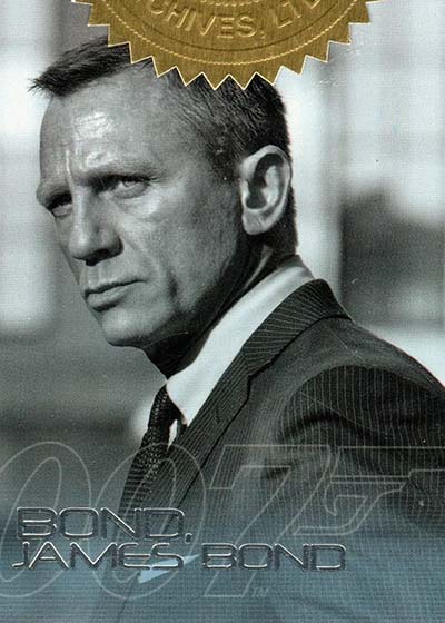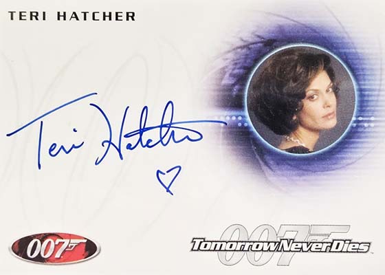Packs have two styles of signatures. The 40th Anniversary Autographs lineup continues to expand and fill in gaps with 19 new cards. Key signers include Daniel Craig, Teri Hatcher and Judi Dench.