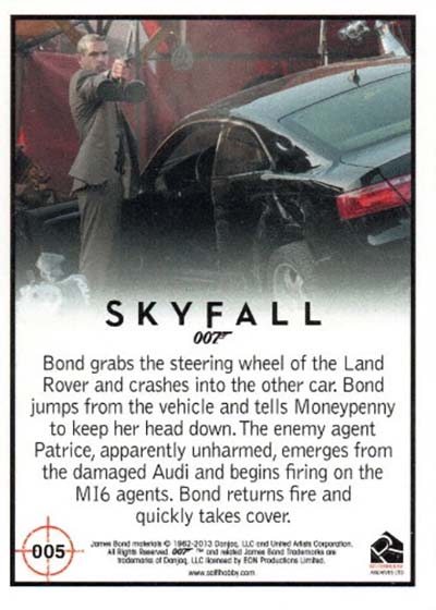 Consisting of 110 cards, the base set is all-Skyfall. Coming out nearly a year after its original release, there are no secrets. Cards cover all the major plots points, twists and action.