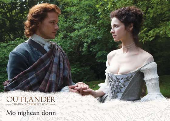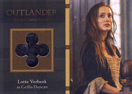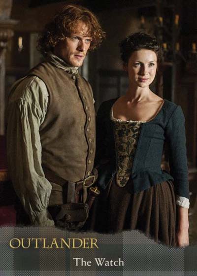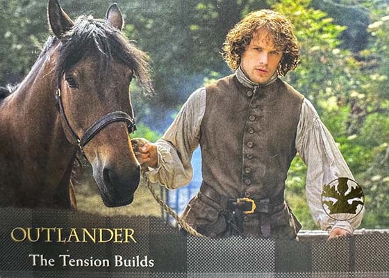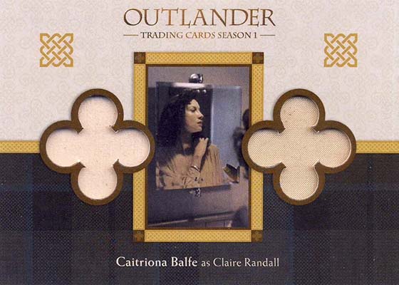 Wardrobe cards have pieces of costumes worn by characters. Packs have 36 different cards available with a final card that was exclusive to the set’s binder. Both Heughan and Outlander’s other lead, Caitriona Balfe, have multiple memorabilia cards.