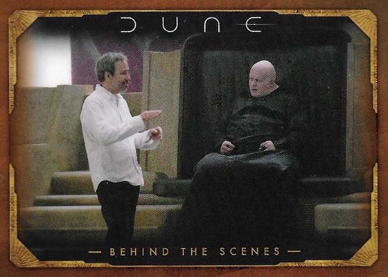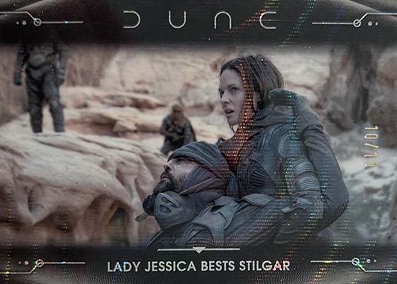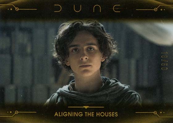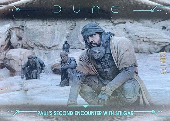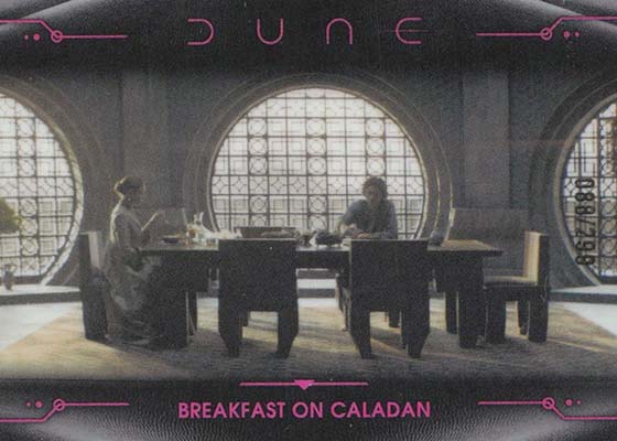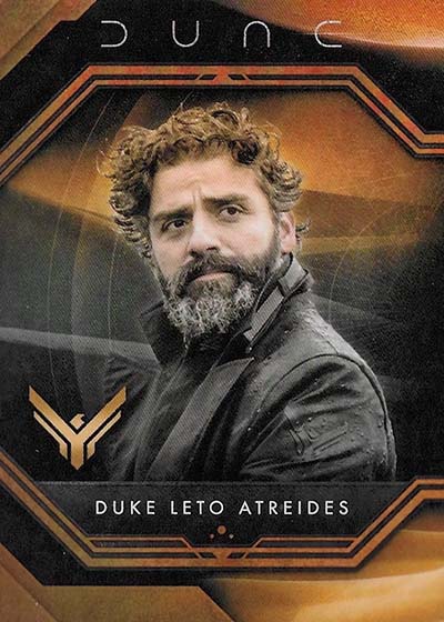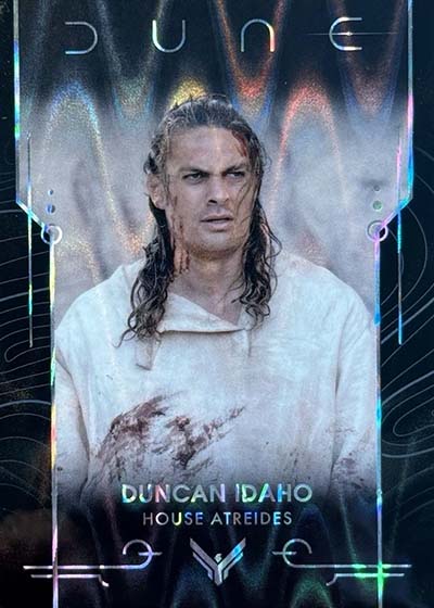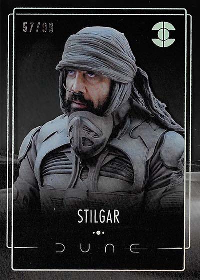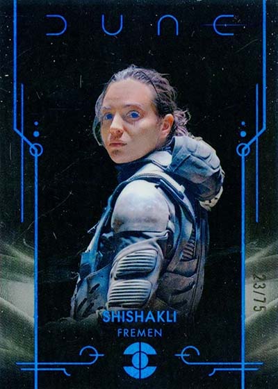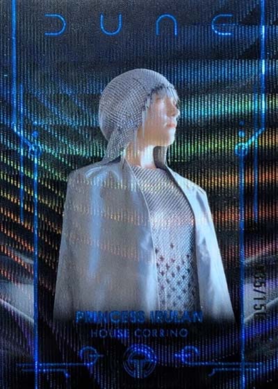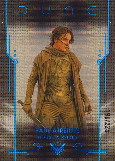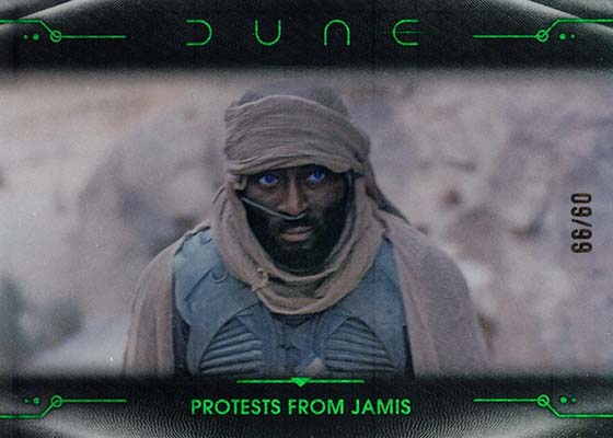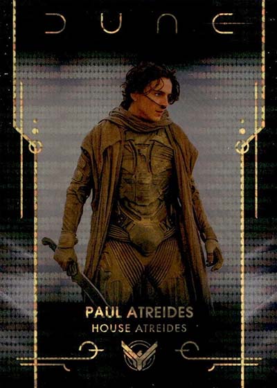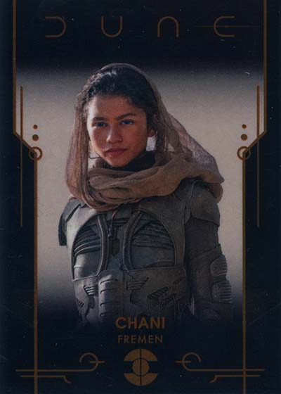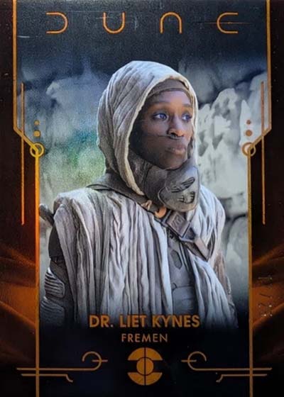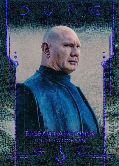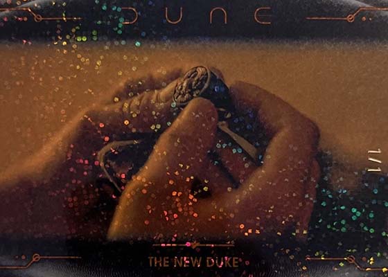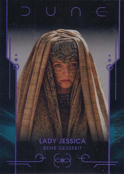 Dune Acrylics are numbered to 99 and offer another look at characters. As the name suggests, these are printed on acrylic stock. Parallels include Green (#’ed/75), Gold (#’ed/50), Orange (#’ed/25), Purple (#’ed/10), Red (#’ed/5) and Blue (1/1).