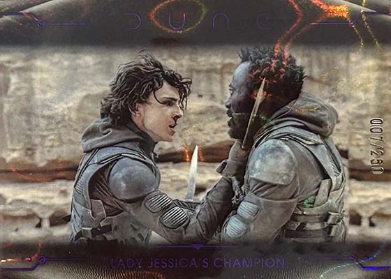 Also numbered to 99 are Dune Sculptures Walls. These use textured art from the movies to showcase characters. Blue Speckle Refractors (#’ed/75), Gold Refractors (#’ed/50), Orange Refractors (#’ed/25), Black Wave Refractors (#’ed/10), Red Refractors (#’ed/5) and Superfractors (1/1) add further rarity.
