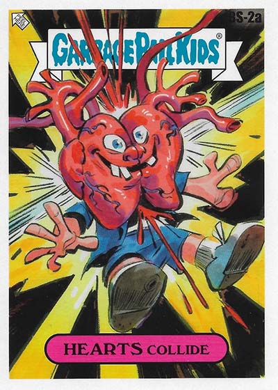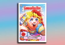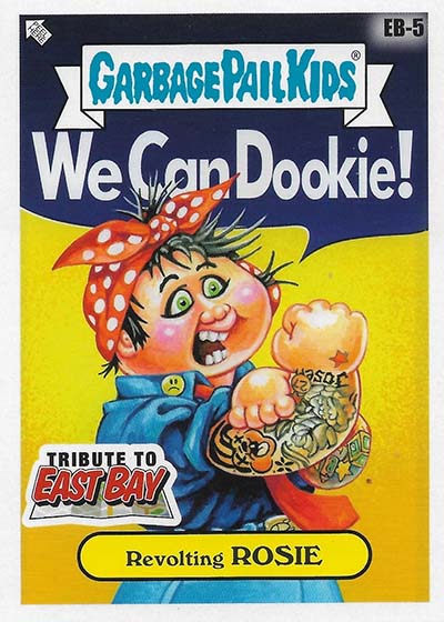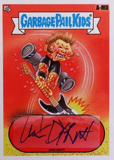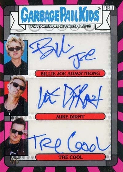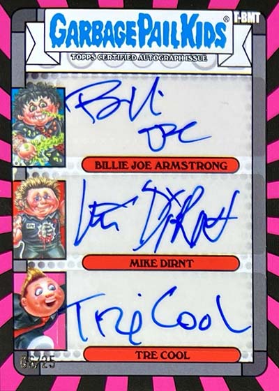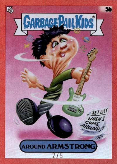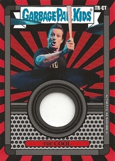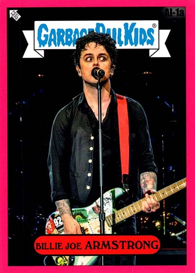 The base set has 100 total cards—50 different A and B name variations. These transform bandmates Billie Joe Armstrong, Mike Dirnt and Tré Cool as well as their songs into Garbage Pail Kids.