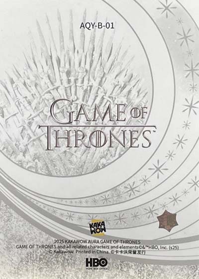 2025 Kakawow Aura Game of Thrones lets a company other than Rittenhouse to play in the franchise’s trading card sandbox. Granted, Aura is intended for overseas distribution but it offers a very different look on the series than what has been done in the past. The checklist opts for modern elegance and a large checklist that has a lot of limited chase elements.