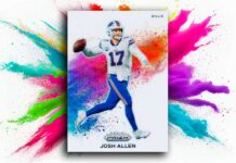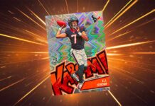 2025 Panini Absolute Football Kaboom inserts feature the most ever in the set’s seven-year NFL run. Expanding on the Vertical and Horizontal versions of recent years, another spinoff has been added. For the first time since Kaboom debuted in a football release, a new parallel joins the checklist as well.