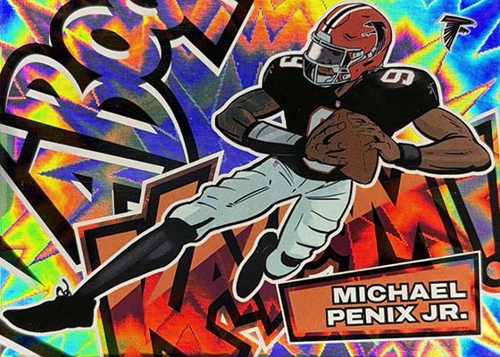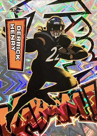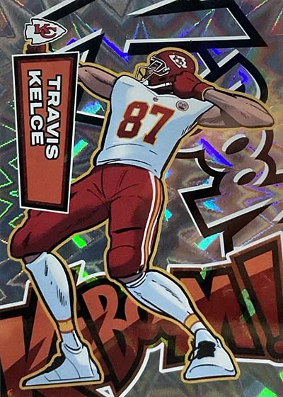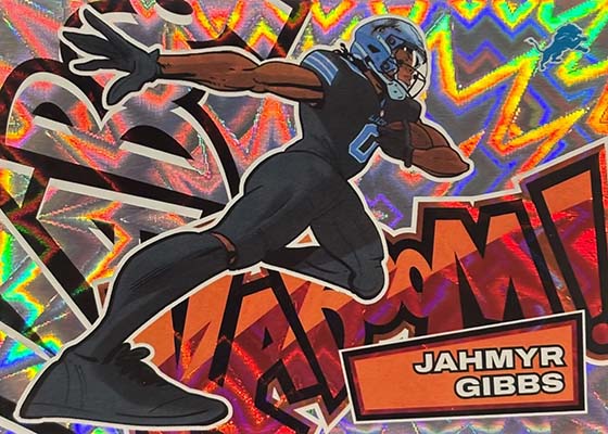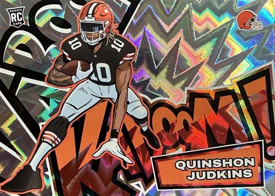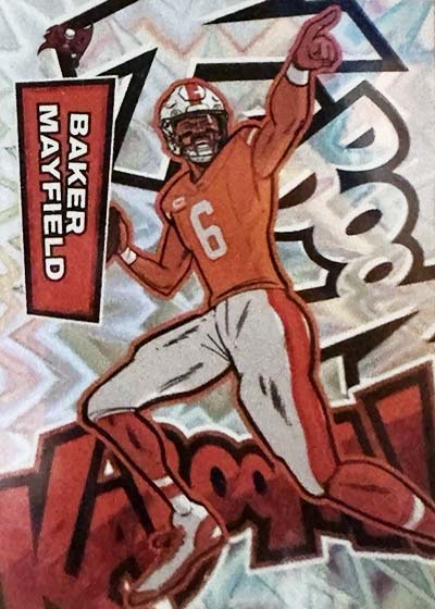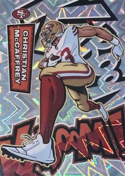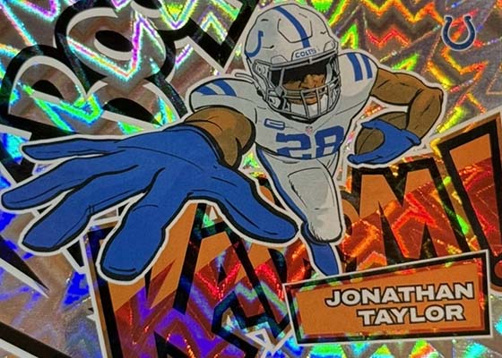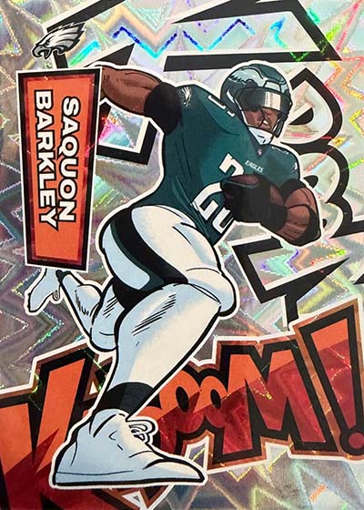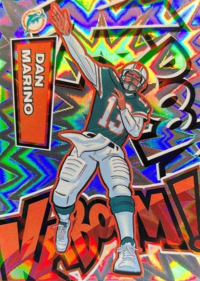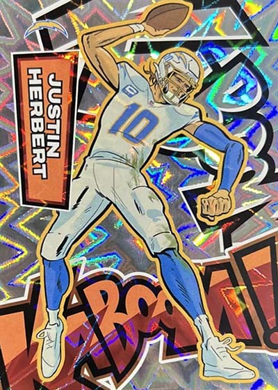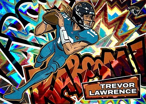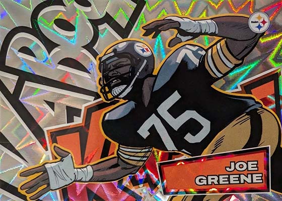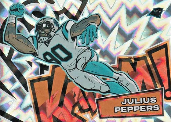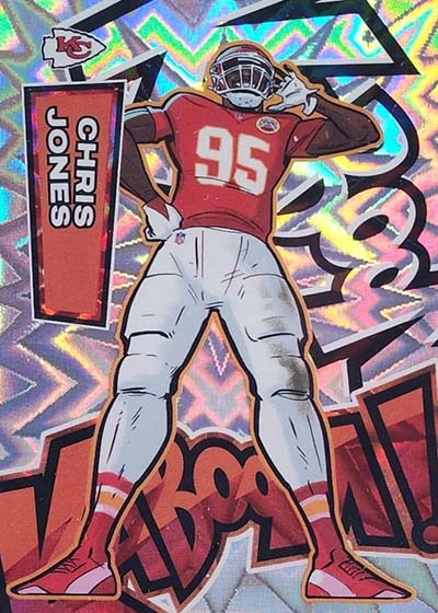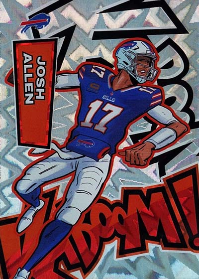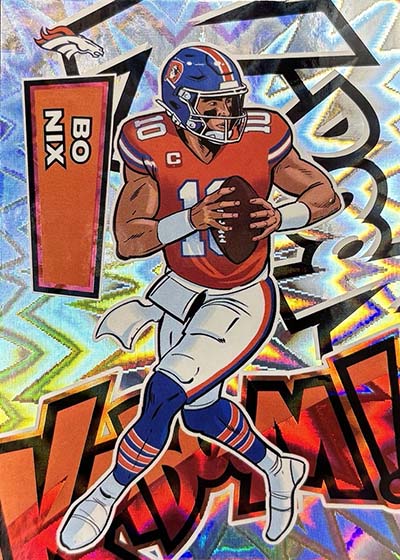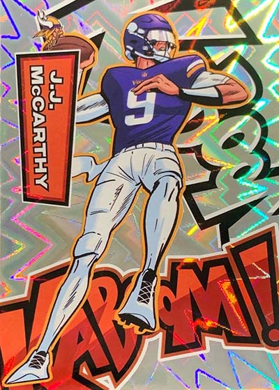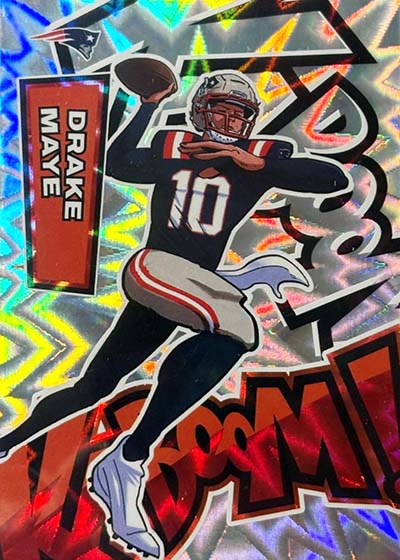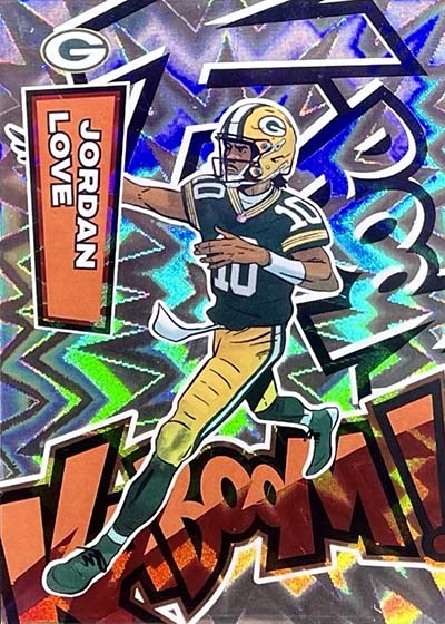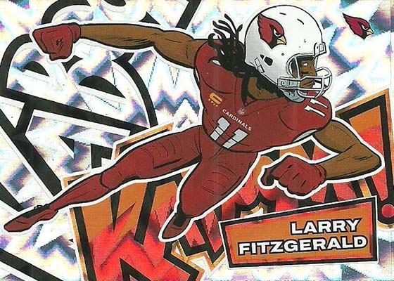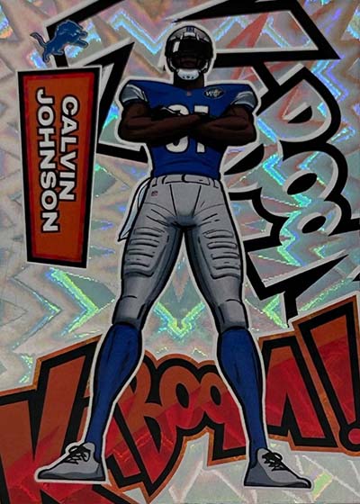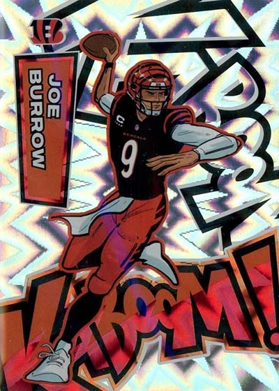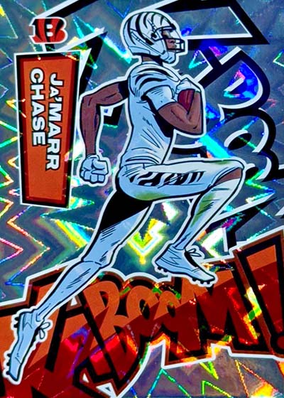 As for the cards themselves, the overall concept remains the same. Players are portrayed as illustrations and look like they out of a comic book. The explosive foil background pattern only adds to the over-the-top nature of the popular inserts.