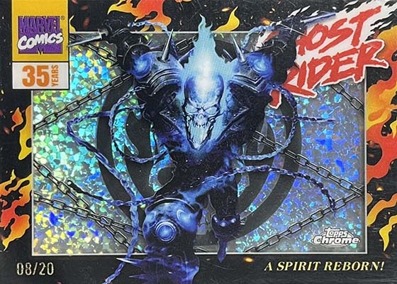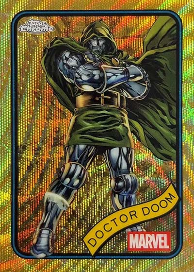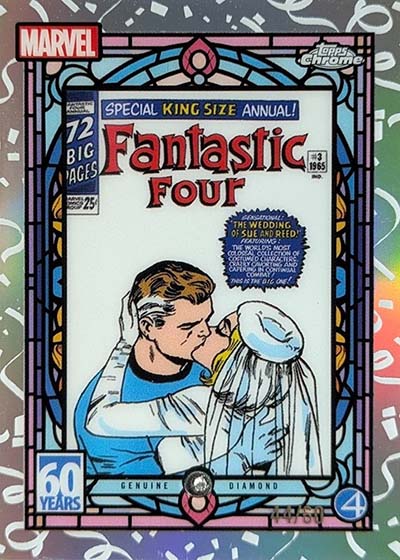 Several short print inserts are a part of the 2025 Topps Chrome Marvel checklist. Reflections makes the jump over from Star Wars. Other rarities include Hidden Gems, Air Marvel, Topps Patrimony, Avengers Infinity, Indestructible, Galactic Legends, Classic Comic Book Covers, and Reed and Sue’s 60th Wedding Anniversary.
