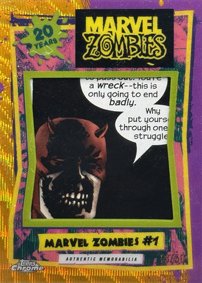 Anniversaries play a central theme in many insert sets such as Golden Anniversaries, X-Men Giant-Size’s 50th, Ghost Rider’s 35th, a half-century of Nightcrawler and 20 years of the New Avengers. There’s also a single-card die-cut honoring S.H.I.E.L.D.’s 60 years. Marvel Zombies’ 20th anniversary is commemorated with relics containing comic panels. Finally, at least when it comes to celebrations, there’s Marvel Anniversaries for notable time passages.