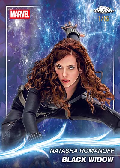 The base set is the same 200 cards as the standard set. It’s dedicated to the characters of the Marvel Cinematic Universe, going all the way back to Iron Man through to The Fantastic Four: First Steps. These aren’t exactly the same as the regular Topps Chrome cards. Sapphire is an upgrade with a shard background.