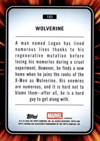 Like other Sapphire sets, the idea is to offer a premium spin-off of the product it’s based on. That means a 200-card base set that matches standard 2025 Topps Chrome Marvel. The characters, the 1990-inspired layout, the card numbers—all are the same. To make it Sapphire, backgrounds get a blue transformation as well as a patterned background.