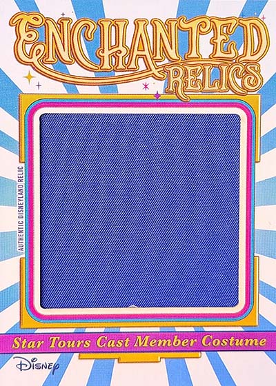Enchanted Relics is the central spot on the 2025 Topps Disneyland 70th Anniversary checklist for memorabilia. These have pieces of park history embedded in them. Items range from old tickets to cast uniforms to Disney Dollars and more.
