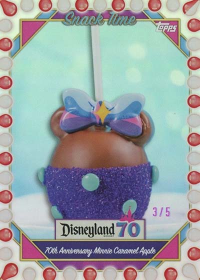All 150 cards also have a couple of thematic variations that offer twists to the general design. Hidden Mickey Variations (#’ed/55) add Mickey Mouse icons to the frame. Red and White Bulb Variations are numbered to 5 and only in boxes sold at Disneyland. These are one of the product’s deeper cuts, referencing Refreshment Corner on Main Street. The snack spot has red and white light bulbs running around its entrance ceiling. However, things didn’t quite work out evenly so one of the corners has a bulb that’s red on one half and white on the other.