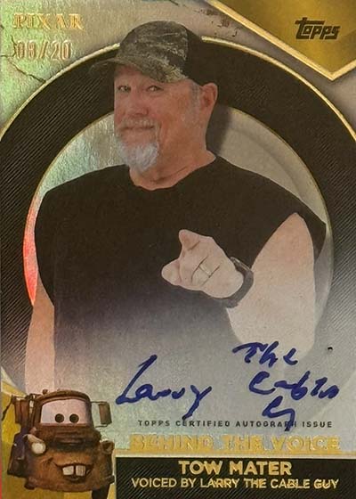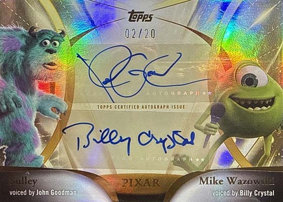 Gilded Pixar Autographs are randomly inserted in the larger packs. Falling one per six-box case, the list of 30 signers includes Tom Hanks, Tim Allen, Billy Crystal, Samuel L. Jackson, Julia Louis-Dreyfus and Larry the Cable Guy.