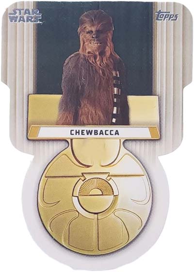 Taking it back to the closing moments of the original film are three Medal of Yavin cards. These die-cuts are done in the shape of the medals Princess Leia presents to Luke Skywalker and Han Solo, and later Chewbacca.