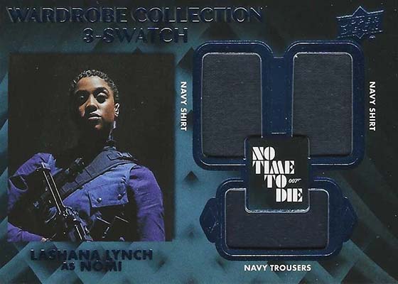 Not Just a Number are manufactured patch cards. Vertical versions stand on their own. Horizontal ones come in three forms. 007 Puzzle are the most common and can be used to build a larger collage. There are also full 007 logos and the film’s title, No Time to Die.