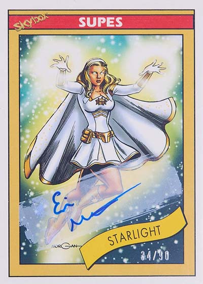 Chase insert themes include Metal Prints (1:60 packs), Team Ups (1:100 packs) and Most Wanted (1:900 packs). There’s also Retro (1:180 packs), which use the classic 1990 Impel Marvel Universe design. Retro also has tough autographs.