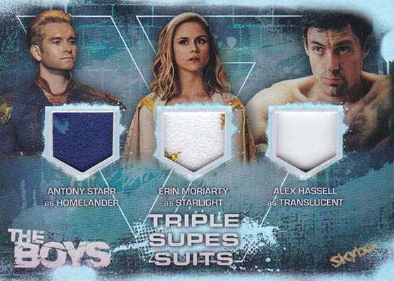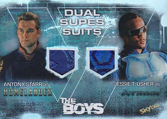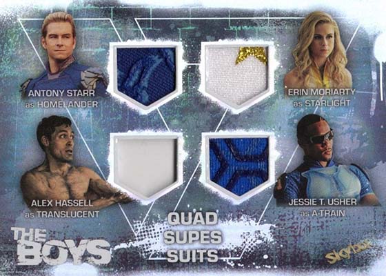 Supe Suits bring memorabilia to the 2025 Upper Deck The Boys Seasons 1 and 2. Dual, Triple and Quad cards are mixed in as well, although some take a tongue-in-cheek approach with “swatches” from Translucent.
