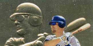 With lots of gold foil and big embossing, the 1997 Topps Stadium Club Pure Gold Jay Buhner lives up to its name.