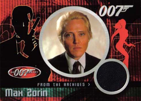 Done under the From the Archives name, two costume cards are available in 2002 Rittenhouse James Bond 40th Anniversary packs. Inserted at a rate of 1:120 packs, they’re approximately every sixth box. Card #CC1 features the very first James Bond, Sean Connery. A View to a Kill‘s Max Zorn (played by Christopher Walken) is the other costume card available in packs.