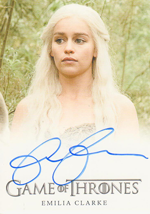 Taking over the role of Sarah Connor for Terminator Genisys is Emilia Clarke, best known for playing the Mother of Dragons on TV’s Game of Thrones, Daenerys Targaryen. Through four seasons worth of sets for the show from Rittenhouse, Clarke has autographs in only the first two.