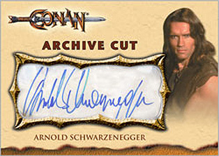 Copies of that card were later used to make a cut signature card by Rittenhouse Archives for their 2009 Conan Movies Autograph Expansion factory set. Those who ordered ten of the limited edition sets got an Arnold Schwarzenegger cut autograph with the signature from the old card embedded into the new one.